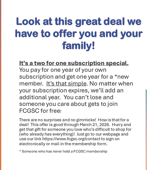 You pay for a one year membership (we'll add on one year to your present membership) and your guest gets a free one year membership!